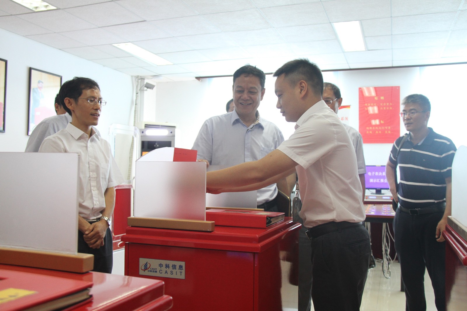 在中科信息數(shù)字會議系統(tǒng)展廳,鄧勇副秘書長參觀了為歷屆黨代會和全國“兩會”會議選舉服務的電子票箱、人民大會堂使用的電子表決器、面向國內(nèi)基層選舉市場研發(fā)的新產(chǎn)品—計票通設備和海外電子選舉系統(tǒng)設備,并了解了中科信息數(shù)字會議系統(tǒng)研發(fā)歷程,以及新型電子選舉系統(tǒng)和電子表決系統(tǒng)在黨的“十九大”和十三屆全國“兩會”上的使用情況。